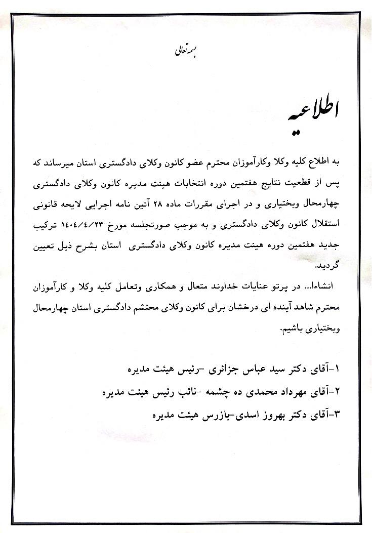 ترکیب هفتمین دوره هیأت مدیره کانون وکلای دادگستری چهارمحال و بختیاری